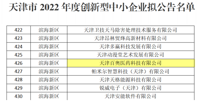 天津百奧醫藥科技有限公司被認定為“創新型中小企業”。