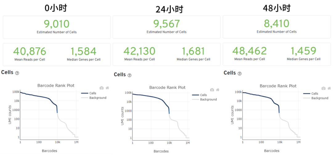 使用(yong)該組(zu)織(zhi)(zhi)保存液分別保存小(xiao)鼠肺(fei)組(zu)織(zhi)(zhi)0小(xiao)時(shi)、24小(xiao)時(shi)、48小(xiao)時(shi),然后將該組(zu)織(zhi)(zhi)消化解(jie)離為(wei)單細(xi)(xi)胞(bao)懸液,利用(yong)CountStar全自動細(xi)(xi)胞(bao)熒光(guang)分析儀檢(jian)測細(xi)(xi)胞(bao)活(huo)性(AO/PI染色)、結團率、活(huo)細(xi)(xi)胞(bao)濃度、細(xi)(xi)胞(bao)直(zhi)徑等參數,然后進行10x Genomics平臺單細(xi)(xi)胞(bao)建(jian)庫測序,獲取數據。