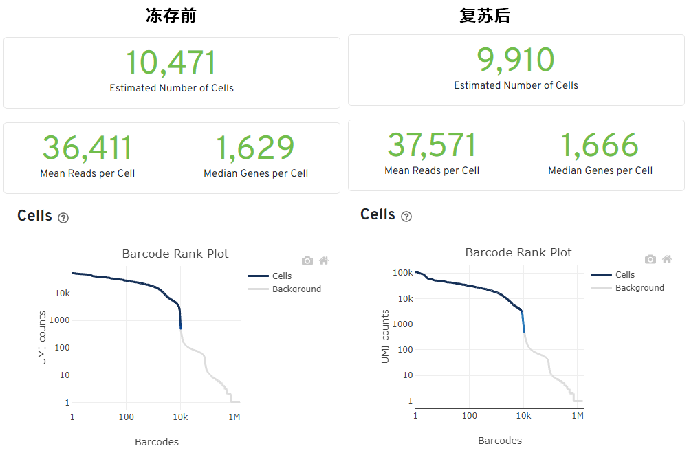數據分析結果:從圖(tu)(tu)7曲線圖(tu)(tu)、捕獲(huo)細胞(bao)數(shu)(shu)(shu)、測序(xu)深度(du)、獲(huo)得基因數(shu)(shu)(shu)結(jie)果(guo)(guo)初步(bu)可以看出,數(shu)(shu)(shu)據結(jie)果(guo)(guo)比較理(li)想,并(bing)且(qie)重復性較好,凍存(cun)前后細胞(bao)樣本得到基因中位數(shu)(shu)(shu)均在(zai)1,600個左右,也較為理(li)想。