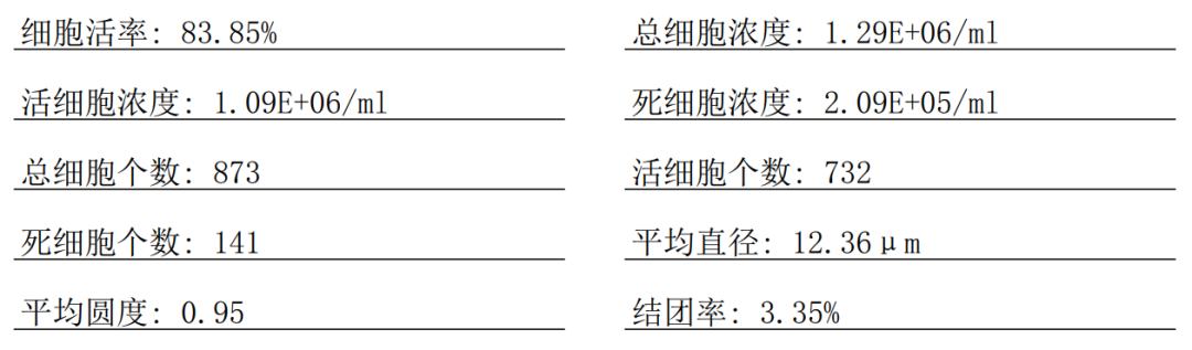 懸(xuan)液質檢結果:圖(tu)12可以看出,制備(bei)的單細胞懸液質量較(jiao)高(gao),活性可達83.85%,結團率僅(jin)為3.35%,其他參數也均能滿(man)足高(gao)通量單細胞測序研究相(xiang)關實(shi)驗要求。