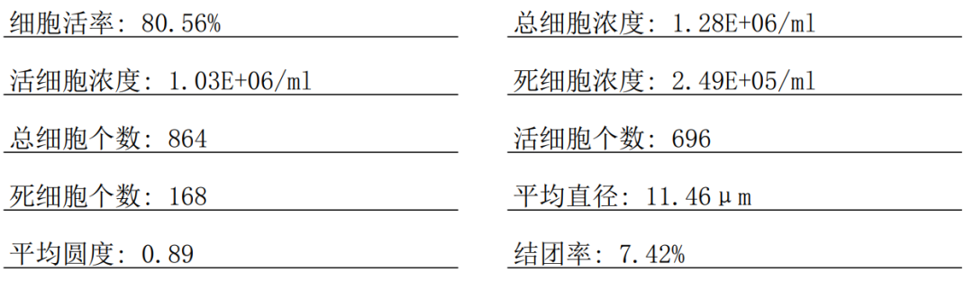 懸液質(zhi)檢結果:圖15可以看出,制備的(de)單細胞懸液質量較高(gao),活(huo)性可達(da)80.56%,結團率僅為7.42%,其他參數(shu)也均(jun)能(neng)滿足高(gao)通量單細胞測序研究相關實驗要求。