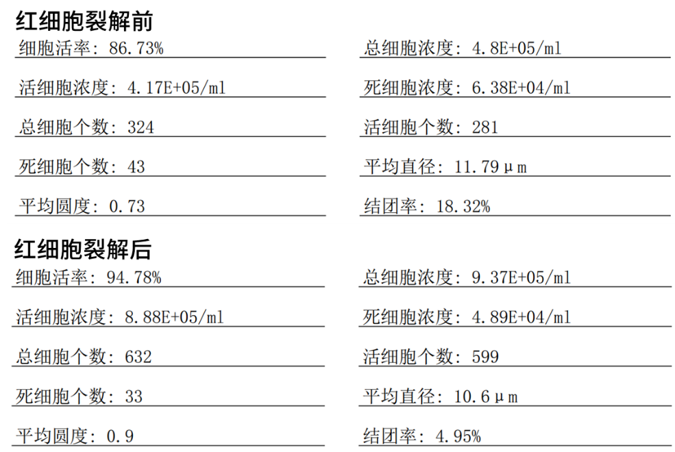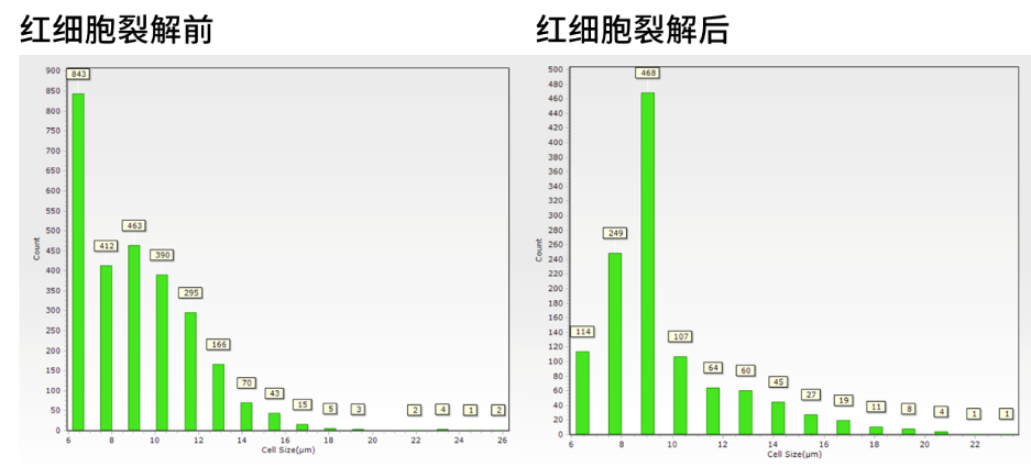 懸液質(zhi)檢結果:從細(xi)胞(bao)(bao)直徑分(fen)布(bu)圖(圖19)可以看出,紅細(xi)胞(bao)(bao)裂解處理后,紅細(xi)胞(bao)(bao)的分(fen)布(bu)明(ming)顯(xian)減少,單(dan)細(xi)胞(bao)(bao)懸液(ye)的有核率參(can)數也從32.4%提升至92.6%(表(biao)1),并且活(huo)性也得到明(ming)顯(xian)改善(shan)。