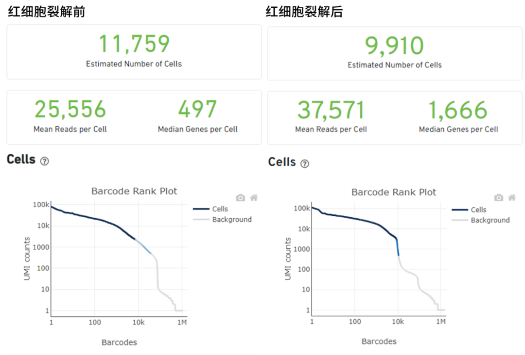 使用該紅細胞(bao)裂解試劑盒處理新(xin)鮮(xian)制備的人(ren)PBMC樣本(ben)(ben),利用CountStar全自(zi)動細胞(bao)熒(ying)光分(fen)析儀分(fen)別對處理前后的樣本(ben)(ben)的細胞(bao)活性(AO/PI染色)、結(jie)團率、活細胞(bao)濃度、細胞(bao)直徑(jing)等(deng)參(can)數進(jin)行質檢,然后進(jin)行10x Genomics平臺單細胞(bao)建(jian)庫測序,獲取數據(ju)。