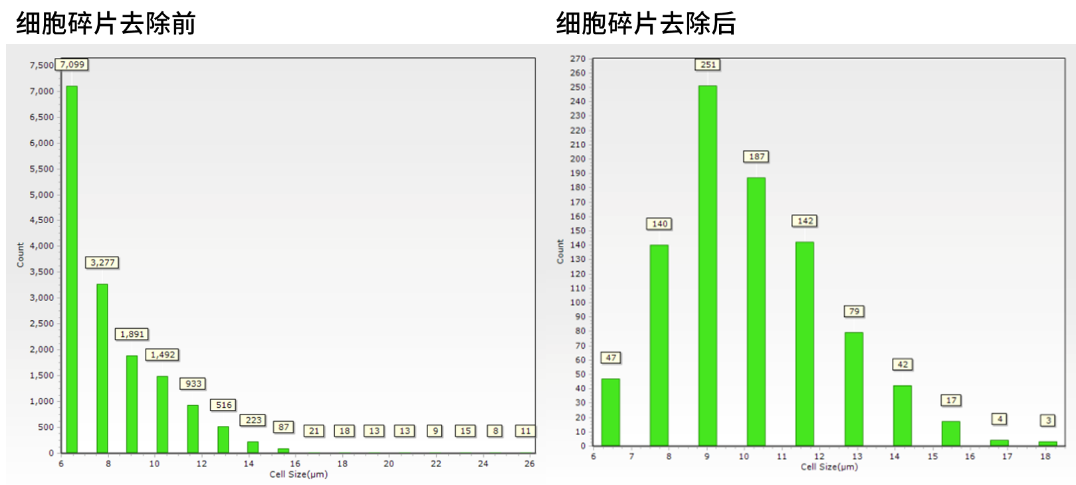 懸液質(zhi)檢結果:從(cong)細(xi)胞(bao)直徑分(fen)布圖(tu)(圖(tu)23)可以看出,細(xi)胞(bao)碎片去除處理后,懸(xuan)液(ye)(ye)中細(xi)胞(bao)碎片的分(fen)布明(ming)顯減少,單細(xi)胞(bao)懸(xuan)液(ye)(ye)的有核率參數明(ming)顯提升(sheng),從(cong)35.7%提升(sheng)至(zhi)92.1%(表(biao)2)。