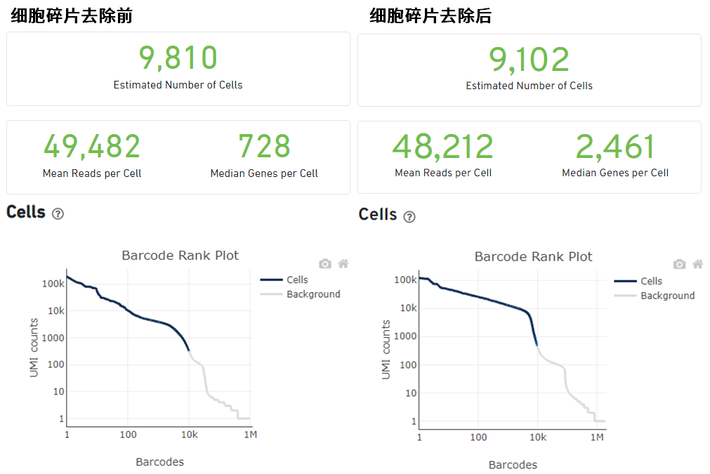 使用(yong)該細(xi)(xi)胞(bao)碎片去除(chu)試劑盒處理新鮮制備的(de)小(xiao)鼠(shu)腦組織細(xi)(xi)胞(bao)懸液(ye)樣本(ben),利(li)用(yong)CountStar全自動細(xi)(xi)胞(bao)熒光分(fen)析儀分(fen)別對處理前后的(de)樣本(ben)的(de)細(xi)(xi)胞(bao)活性(AO/PI染(ran)色)、結團率(lv)、活細(xi)(xi)胞(bao)濃度、細(xi)(xi)胞(bao)直(zhi)徑(jing)等參數進(jin)行(xing)質檢,然后進(jin)行(xing)10x Genomics平臺(tai)單(dan)細(xi)(xi)胞(bao)建庫測序,獲取數據。