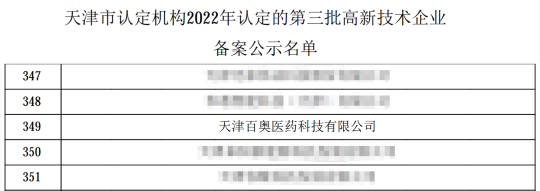 近日,天津(jin)(jin)(jin)市(shi)科學技術(shu)局發(fa)布《市(shi)高(gao)企(qi)認定辦關(guan)于(yu)天津(jin)(jin)(jin)市(shi)2022年第(di)三批擬更(geng)名高(gao)新(xin)技術(shu)企(qi)業名單公(gong)示》,天津(jin)(jin)(jin)百(bai)奧(ao)醫藥科技有限公(gong)司成功(gong)入選,體現(xian)了(le)百(bai)奧(ao)醫藥銳(rui)意(yi)進(jin)取(qu)、穩扎穩打的(de)精神,是(shi)百(bai)奧(ao)醫藥在(zai)發(fa)展進(jin)程(cheng)中重要的(de)里程(cheng)碑。